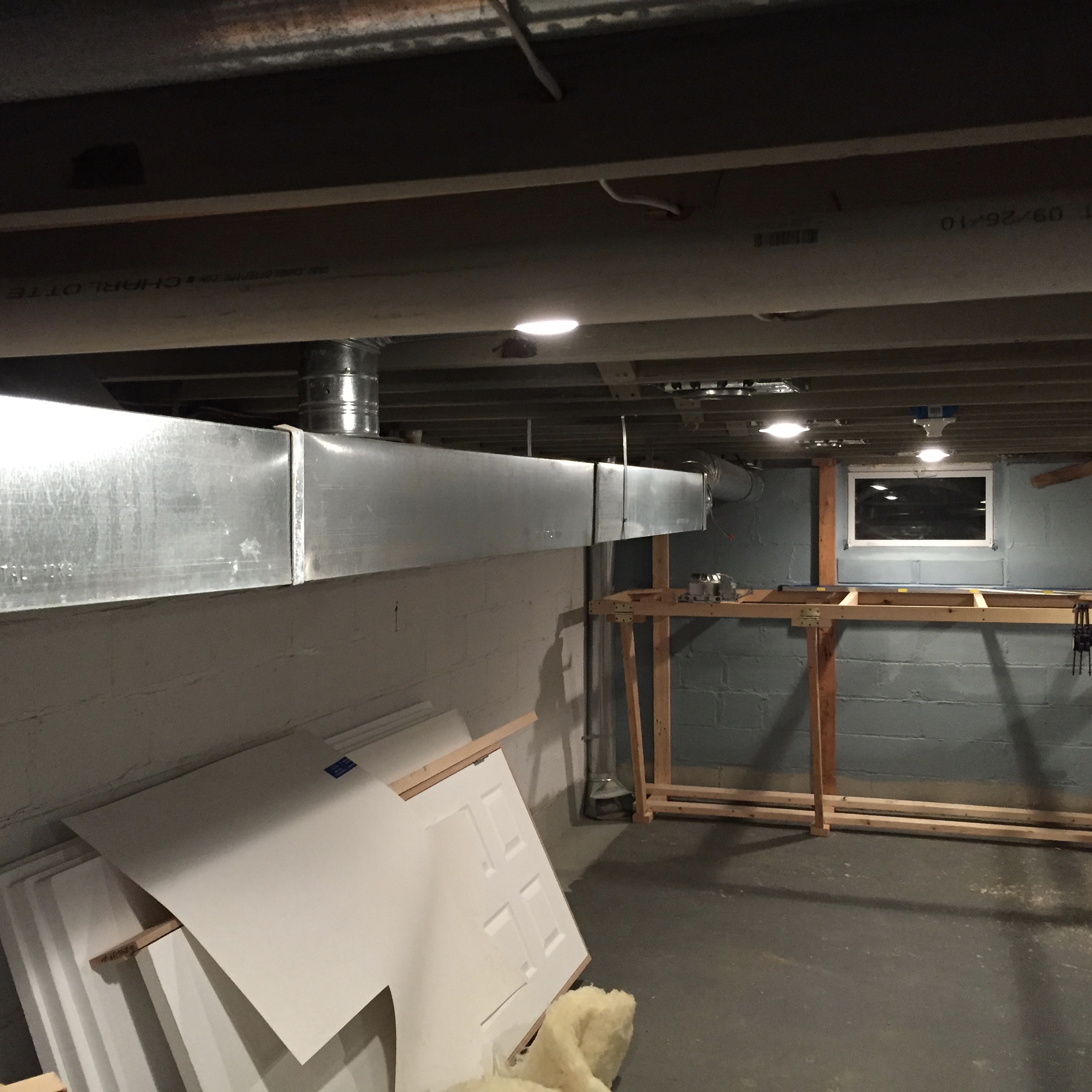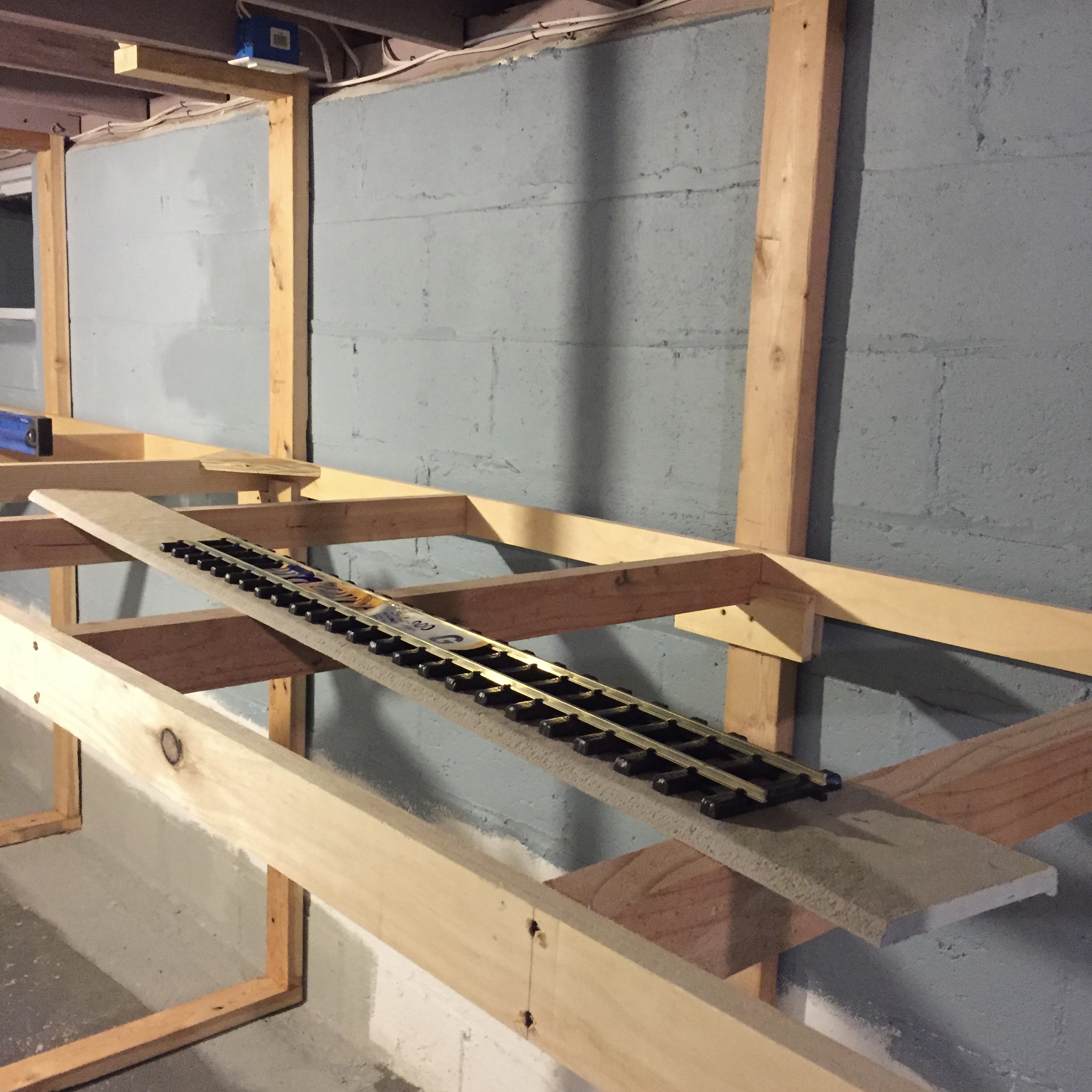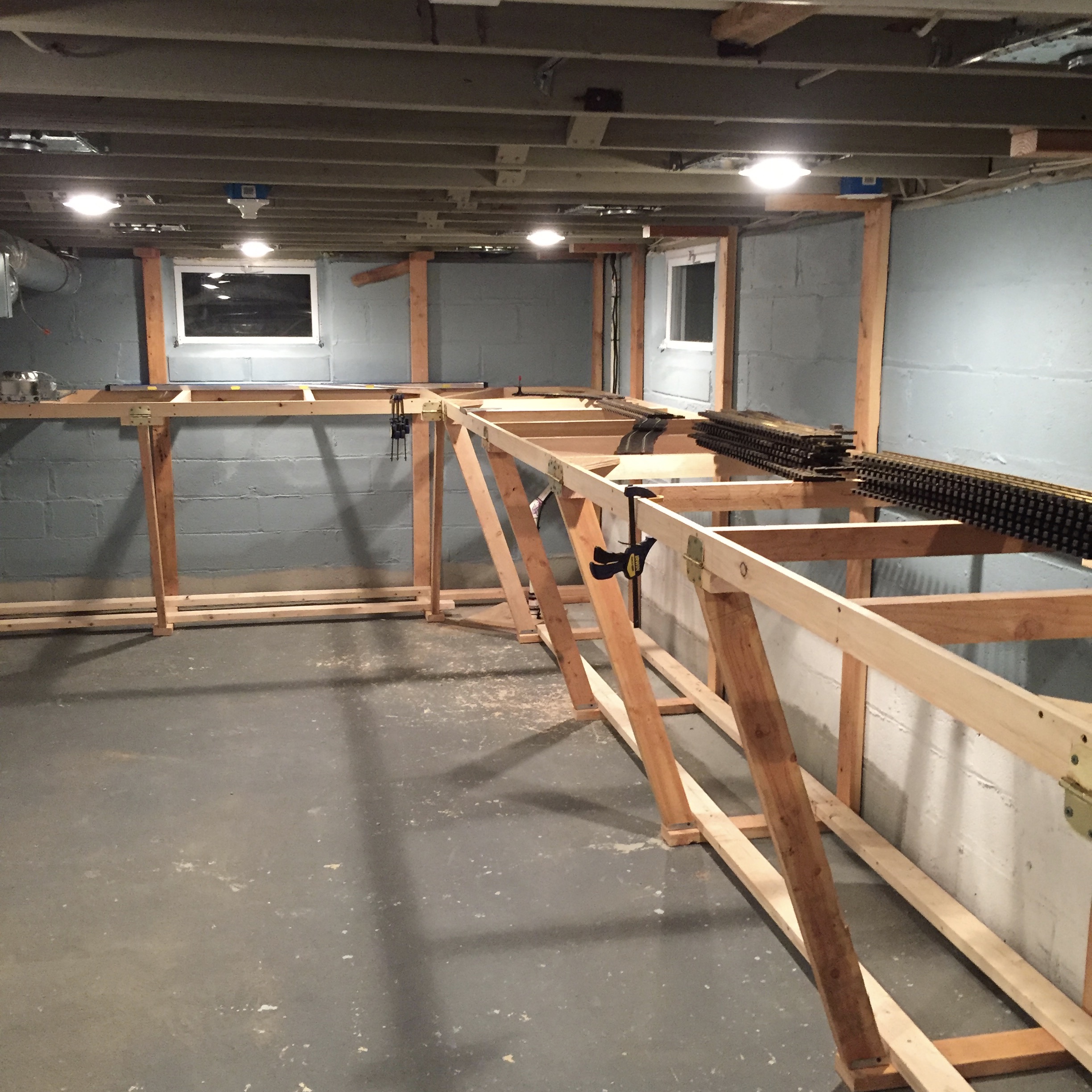 September 5, 20178 yr So I've finally told myself it was time to start my indoor layout in the newer section of the basement of our 109 year old remodeled farm house. The newer section has a ceiling height of just a bit over 6 ft 2 inches which is just enough for my 6 ft 2 inch frame. I decided on module type bench work of 3 ft x 8 ft sections, made to be taken down easily because the wife is looking at houses AGAIN. When the home was renovated back in 2010 there was no consideration for using the basement for much other than storage, (isn't it just the way the model RR guy get the less than ideal basement). There are several obstacles in the way, I have to move the water heater including the water and gas lines and make some minor modifications and exceptions for the large HVAC ducting but it looks like it will work. I collected a bunch of 2 x 4s off projects which made the wall supports, front legs and ripped down pieces for the inner frame stringers. I used surplus 3 1/2" butt hinges to secure the legs to the front of the modules and the rear of the modules just slide into wooden brackets so to remove the modules just pull the hinge pins and lift up. there are no screws or nails holding the back supports to the masonry walls as I did not want to drill holes below grade, those supports are held in place by 2 screws into the floor joists at top and the bottoms held in place by 2 x 4 stringers which will also provide storage under the layout. The modules will not be screwed together rather held in place by notches in the rear supports and the butt hinges. The module outside frames are 2 x 3 with ripped 2 x 4 inner stringers, the sub roadbed will be 3/4" plywood with homosoate as roadbed for the ballast. The roadbed will only be under where the track will be, the scenery and buildings will be constructed on 2" thick foam insulation board on lift out sub assemblies, I used this method on my Christmas layout and it works great. Track will be code 250 Sunset Valley rail with Accucraft NG tie strips, I wanted to hand lay the track with wood ties and hand spiked rail but I'm 68 now and time is ticking, I'm estimating it should be about 250 ft of track. The section of basement I'm using is 11 ft 8 inches x 32 ft 7 inches. I haven't finalized the track plan as yet but it will be using a minimum of 10 dia. curves and #6 Accucraft turnouts. I have to accommodate a large HVAC duct running almost the entire length of the left side of the 32 ft wall so the benchwork on that side will be place to the right of the duct with a backdrop extending down to hide the duct but there will be a hidden run of track on a 12" wide shelf running on the other side of the duct against the outside of the 32 ft wall. Basically a single track main line design with passings sidings and switching where ever possible. As of today I've finished an "L" section of bench work and installed ceiling lighting.