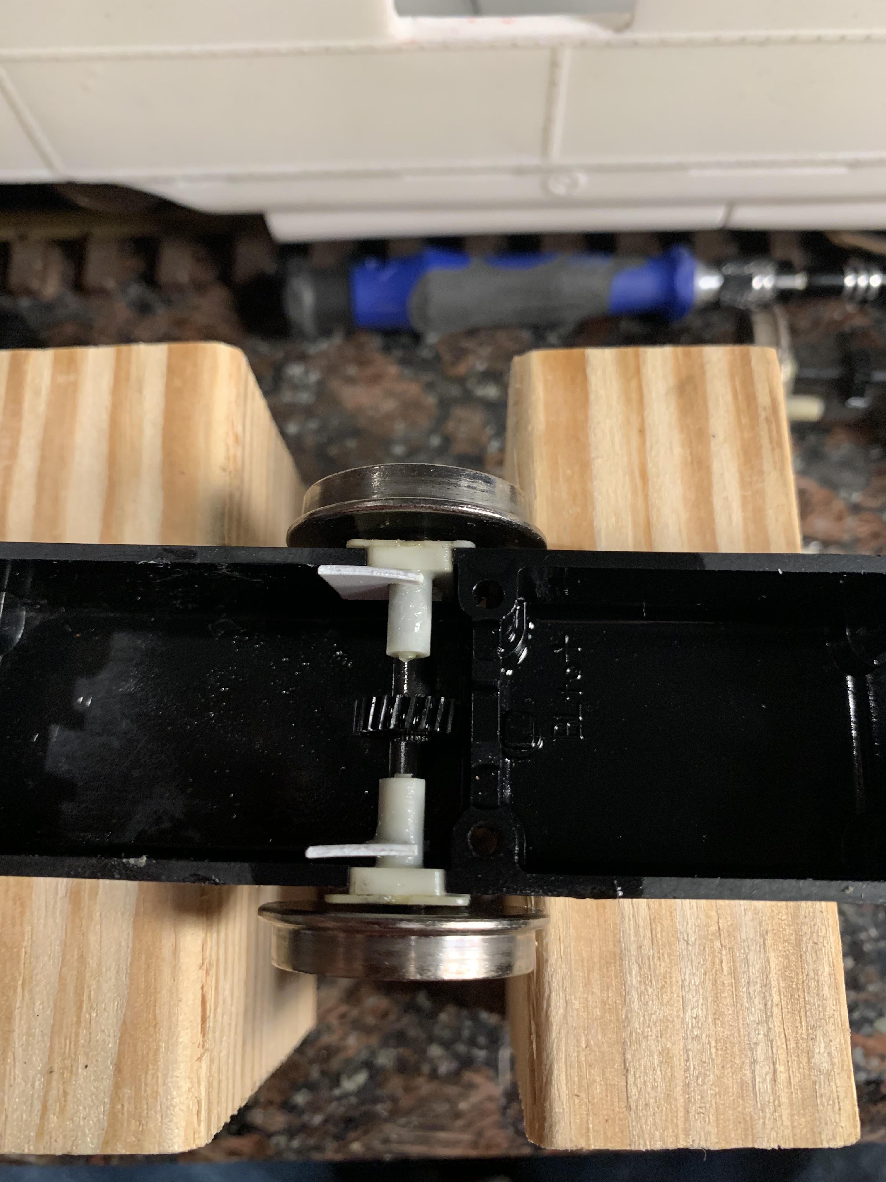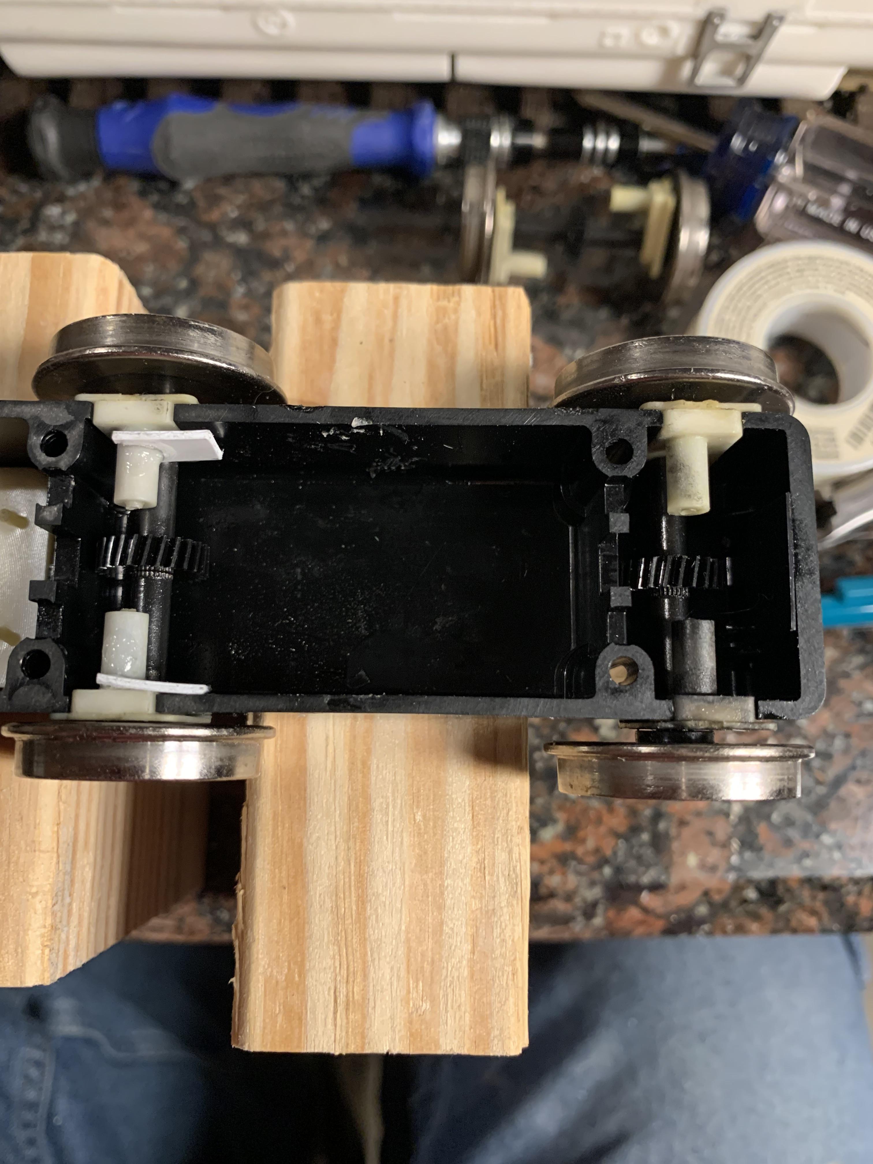 December 19, 20223 yr Author Some of you may know this about the center axle of the 3 axle NWSL block. The center axle does not have bushings between the case and the wheel as the outside axles have. The center one is allowed to float for tighter radii. Well sometimes the pickup bearing will float outside the case and cause the axle to tilt. It will not right itself, so the only way to correct this is to disassemble the block and re install this bearing. The white tabs that you see, were glued on the bearing to prevent the bearing from slipping outside of the case. The axles are still allowed to track back and forth without dislodging.