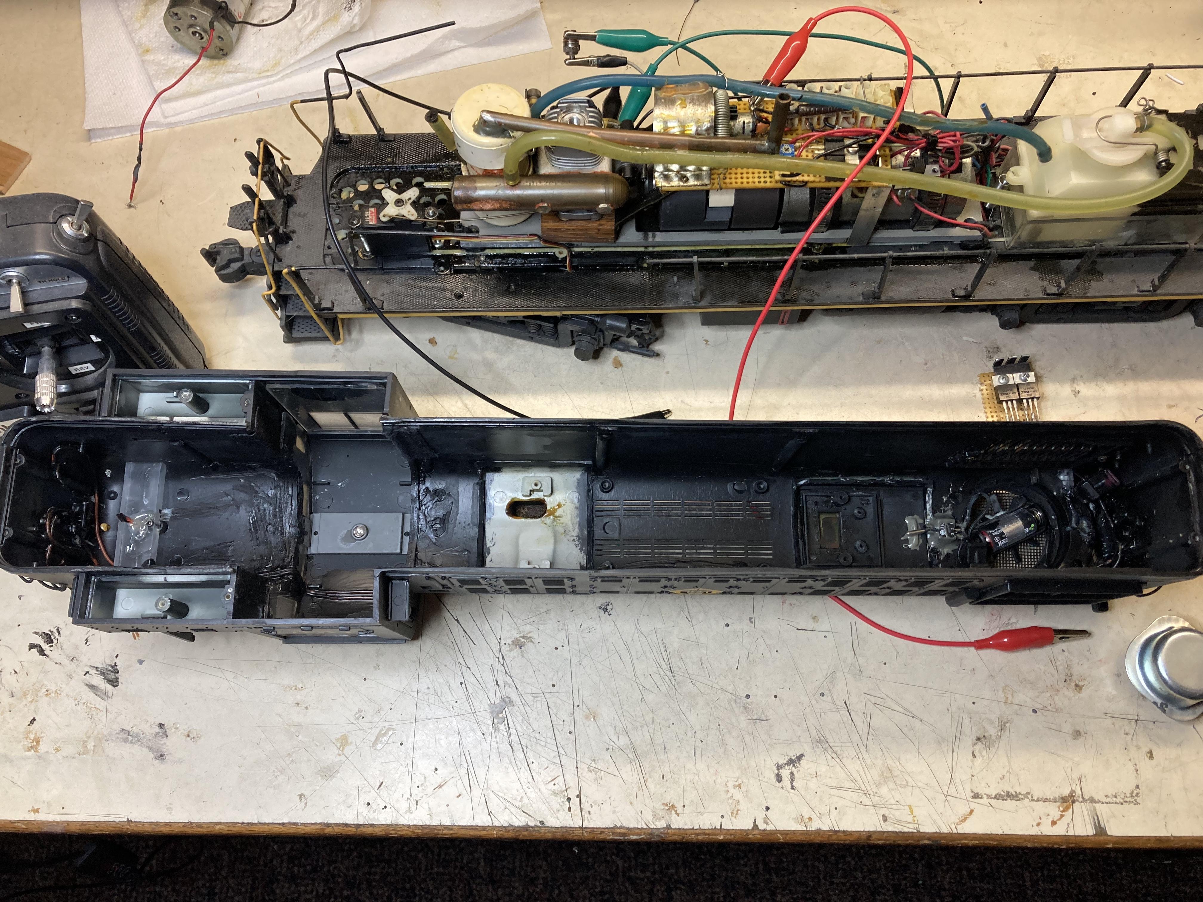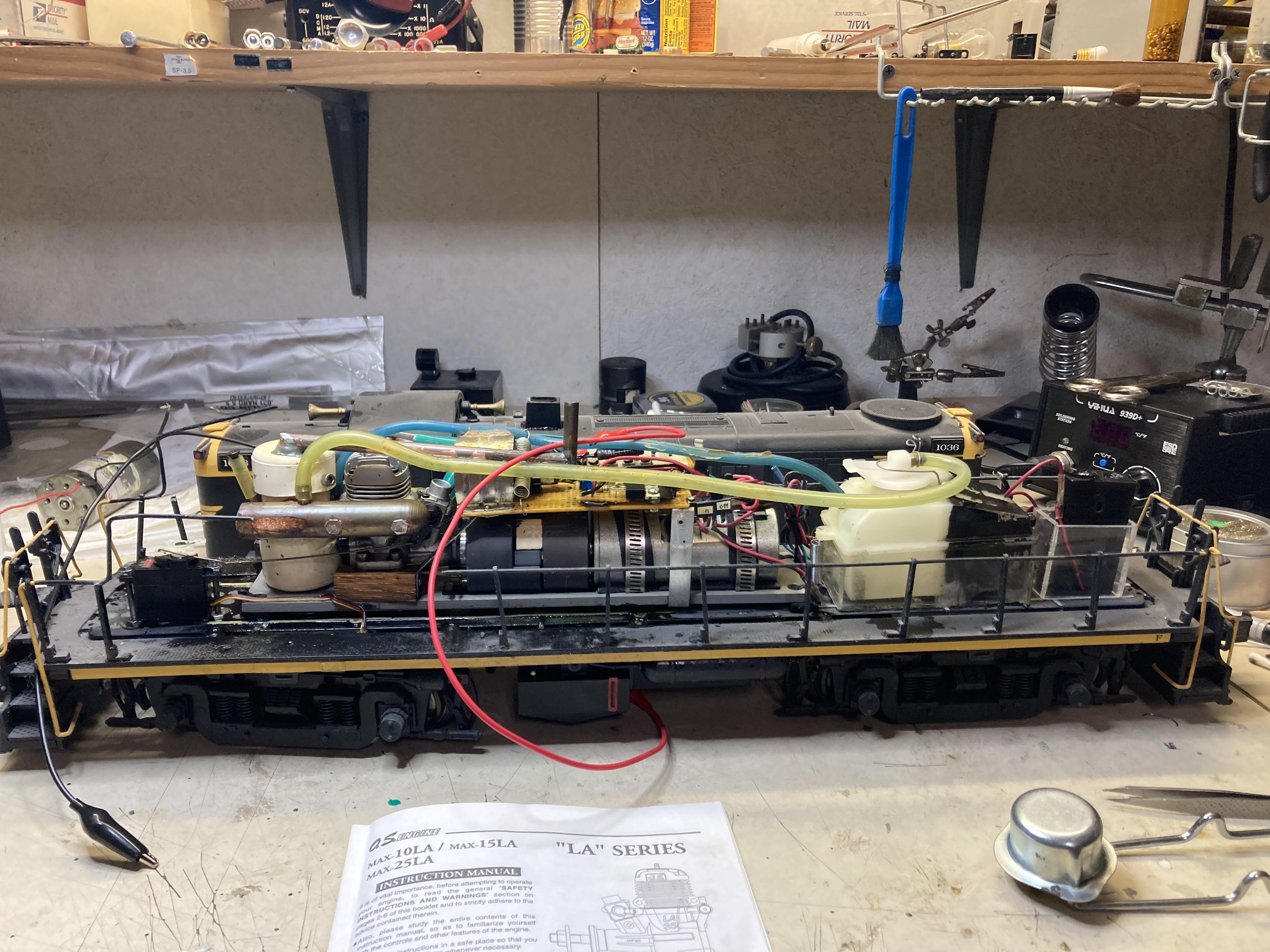April 15, 2025Apr 15 Author Chuck, thank you. Ray, I can't take much credit, was designed by Jerry Hyde. He sent me a box of assorted parts, the engine is my choice. The design was hand drawn on a piece of paper. R/C is what it is. Hardest part was 'hollowing out' the body while maintaining strength to hold it together, then squeezing it all into the narrow body of an RS locomotive. Hind sight I would have used a full body loco Taking this pic I remembered I also installed battery to operate the locomotive lights. Despite the rude noise it is fun to watch and run. I admit, I did make some electrical modifications, other wise wouldn't be me. Still havin' fun.