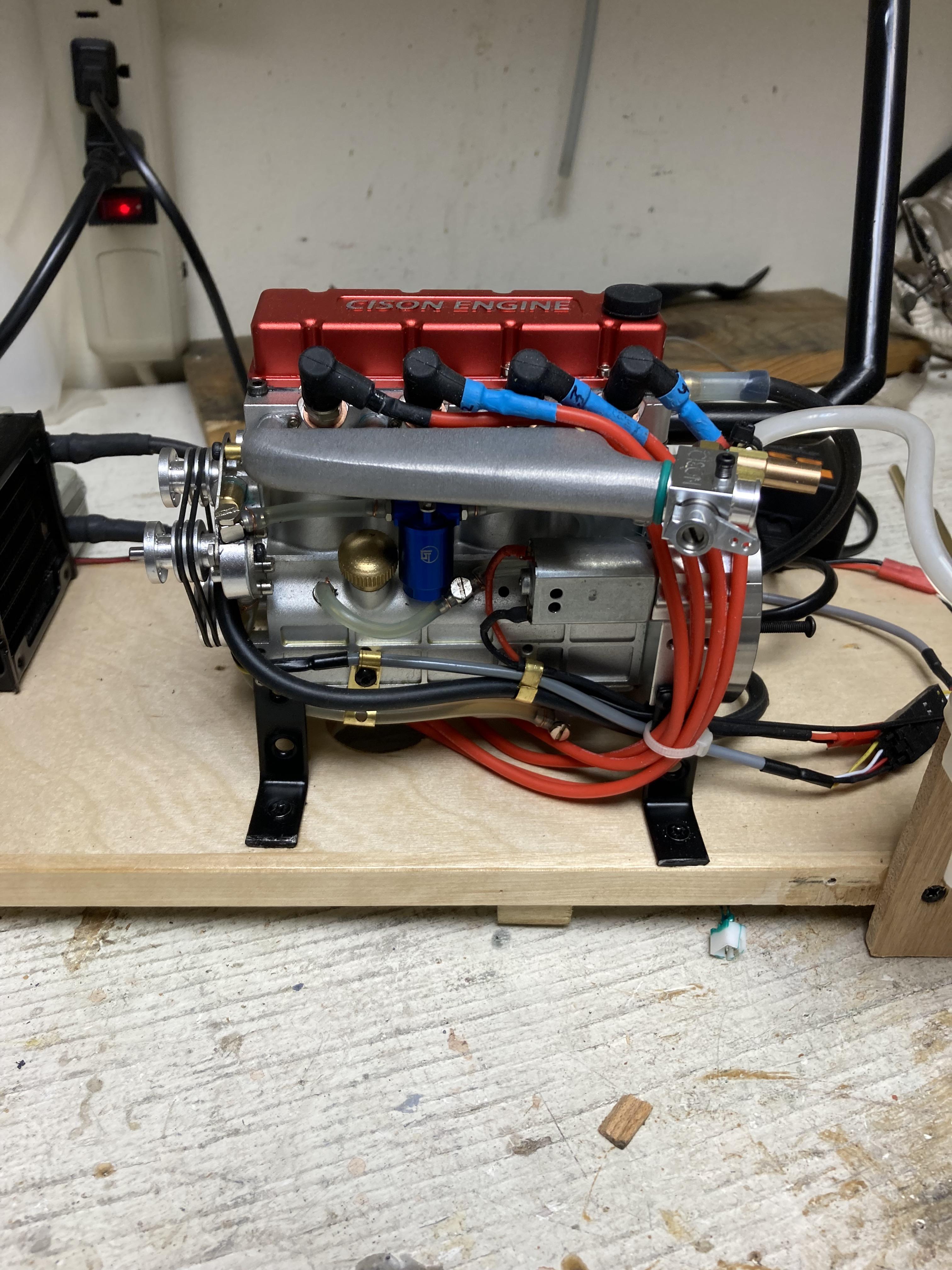 May 29, 2025May 29 Author Made progress: built a more solid base in hopes of it running quieter and with less vibration. It seems to have worked. Got the idle down to where I want it. Even thought the vibrations are way down, the set screw holding the universal joint to the engine output kept loosening so ground a flat spot on the shaft, better. Received a replacement starter motor for the 4 cylinder unit, believe it is an upgrade from the one supplied in the kit. Much stronger, doesn't hesitate on the compression strokes. This one runs on gasoline, which I prefer, much cleaner than the nitro. Still need to start that one. https://youtu.be/TeMD9fr9iF4